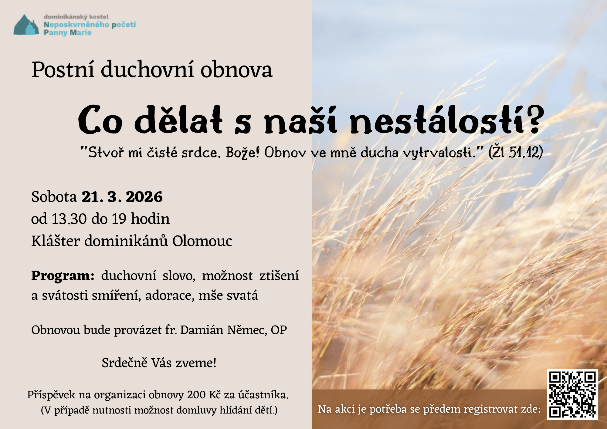 Duchovní obnova se bude konat v sobotu 21. března 2026 v našem klášteře. Provází fr. Damián Němec OP.